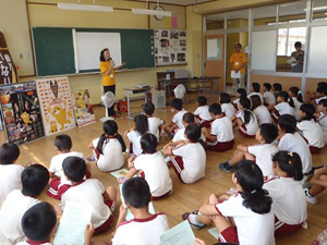 「豊川いなり寿司で豊川市をもりあげ隊」の隊員は、地元の大葉が入った「大葉の塩やきそば」を考案した5、6年生に、「ご当地グルメを通じた地域おこし」をテーマに公演しました。